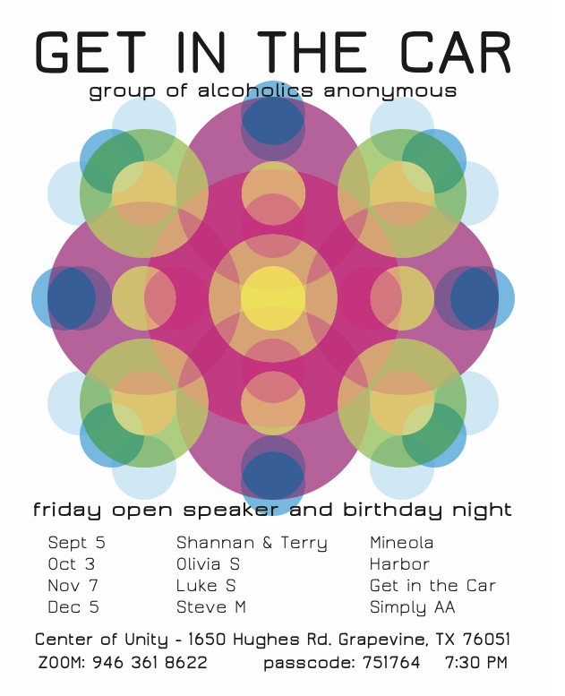 Center of Unity 1650 Hughes Rd., Grapevine, TX, United StatesHybrid: ZOOM: 946 361 8622 | Passcode: 751764 Speaker: Alex M., Serenity Group